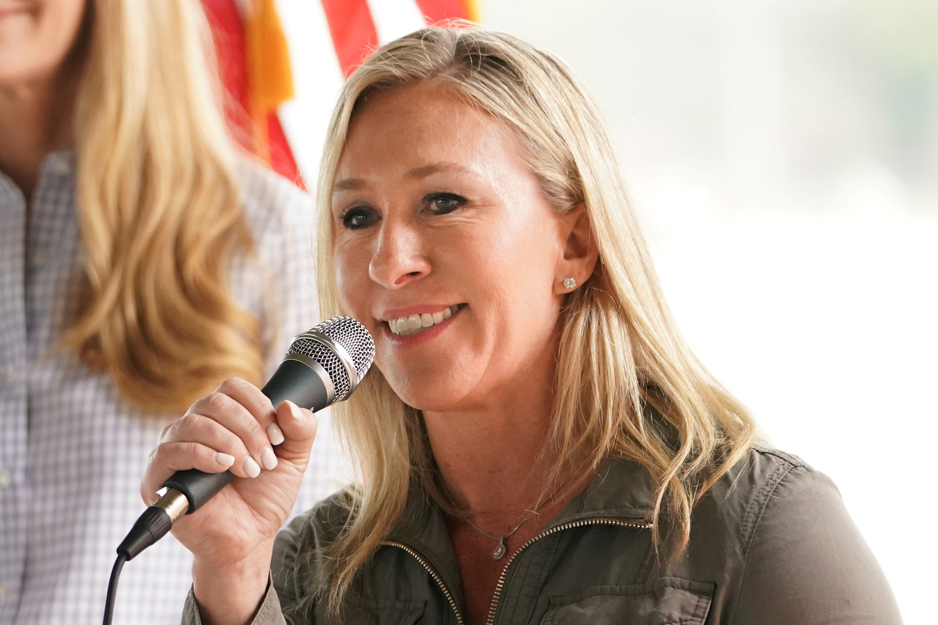 Marjorie taylor greene addressing republicans from her congressional district during a local party event in dalton, georgia, on may 15.